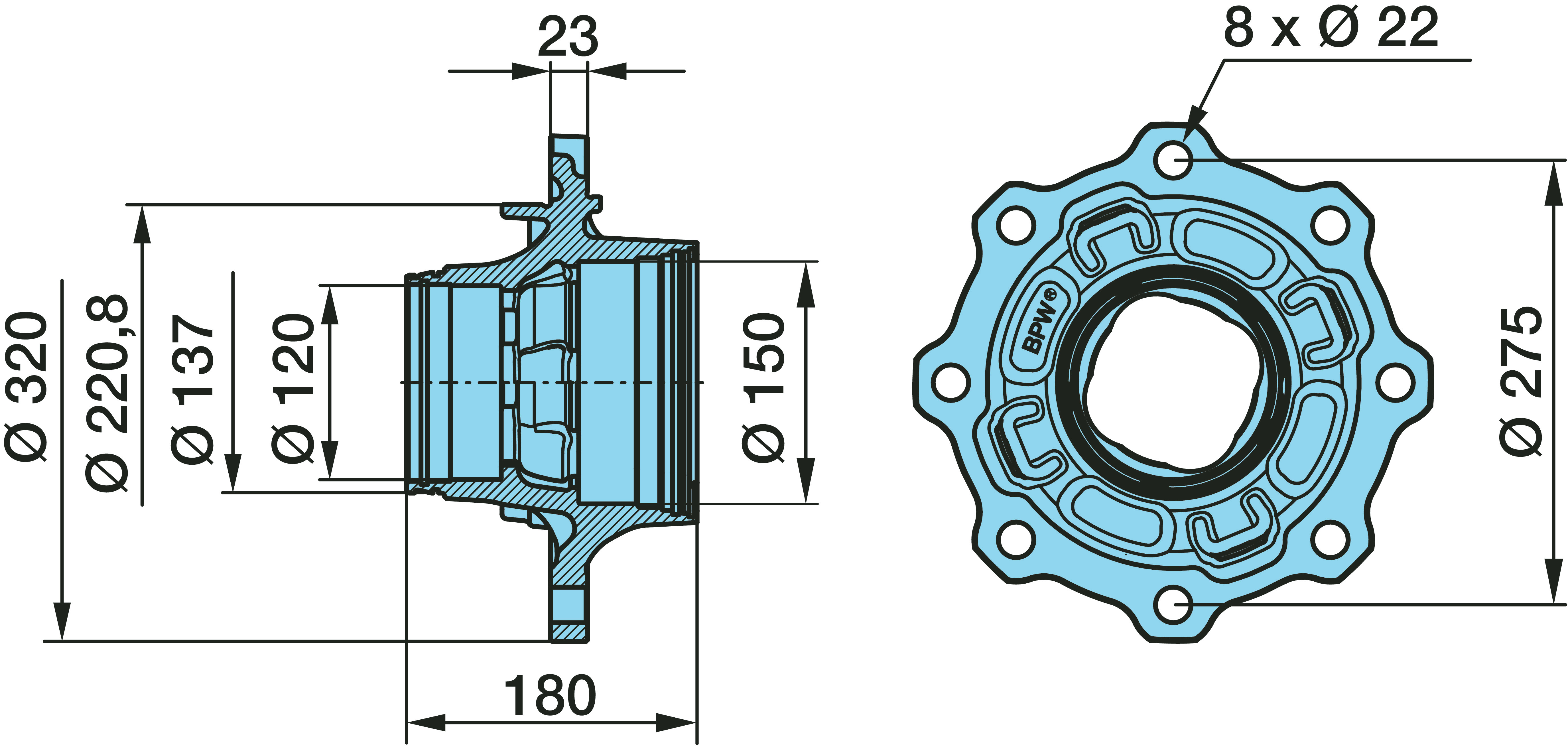 Dimension: Ø 137 / 120/150 / 220,8 / 8 x Ø 22 / 275